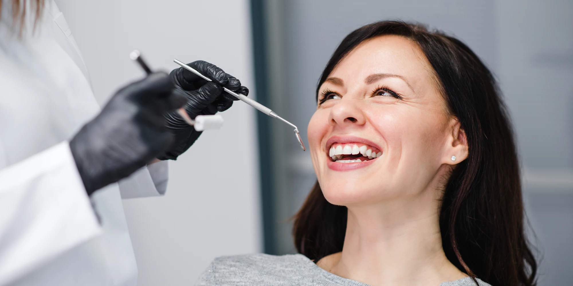 Dentist Flushing NY Woman Smiling in Dentist Chair While Getting a Check Up